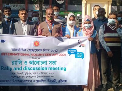 ‘ভলান্টিয়ার নাউ ফর আওয়ার কমন ফিউচার’ এই শ্লোগানকে সামনে রেখে বেসরকারী উন্নয়ন সংস্থা ফ্রেন্ডশিপের উদ্যোগে রবিবার সকালে চিলমারী উপজেলা পরিষদ চত্বর থেকে একটি র্যালি বের করা হয়। র্যালিটি উপজেলা সদরের প্রধান প্রধান সড়ক প্রদক্ষিণ করে উপজেলা পরিষদ সভাকক্ষে উপজেলা নির্বাহী অফিসার মোঃ মাহবুবুর রহমানের সভাপতিত্বে আলোচনা অনুষ্ঠিত হয়। সভায় উপজেলা মাধ্যমিক শিক্ষা অফিসার মোঃ তাহের আলী, সাপ্তাহিক যুগের খবর সম্পাদক এস, এম নুরুল আমিন সরকার, ফ্রেন্ডশিপের ম্যানেজার (ফিল্ড অপারেশন) মোঃ শফিয়ার রহমান, প্রজেক্ট ইনচার্জ মোঃ লাবিবুল ইসলাম, সিনিয়র প্রজেক্ট ম্যানেজার মোঃ মোশরেফুর রহমান, সিডিপিএফ এর নির্বাহী পরিচালক মোঃ লুৎফর রহমার, স্বেচ্ছাসেবক মোঃ মাইদুল ইসলাম ও কল্পনা খাতুন প্রমুখ বক্তব্য রাখেন। উল্লেখ, ফ্রেন্ডশিপের পক্ষথেকে ২০১৮ সাল থেকে দিবসটি পালন করা হচ্ছে।