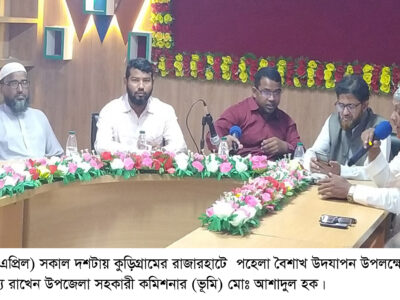 প্রহলাদ মন্ডল সৈকত, রাজারহাট (কুড়িগ্রাম) প্রতিনিধি: কুড়িগ্রামের রাজারহাটে পহেলা বৈশাখ উদযাপন উপলক্ষে প্রস্তুতি সভা অনুষ্ঠিত হয়েছে। মঙ্গলবার(৮এপ্রিল) সকাল দশটায় উপজেলা অফিসার্স ক্লাবে উপজেলা সহকারী কমিশনার (ভূমি) মোঃ আশাদুল হকের সভাপতিত্বে বক্তব্য রাখেন উপজেলা মাধ্যমিক শিক্ষা কর্মকর্তা মোঃ আব্দুর রব, উপজেলা শিক্ষা কর্মকর্তা মোঃ শরীফ আহম্মদ, প্রেসক্লাব রাজারহাট এর সভাপতি আব্দুল কুদ্দুস ও বিদ্যানন্দ ইউনিয়ন পরিষদ চেয়ারম্যান মোঃ তাইজুল ইসলাম। সভায় জাতীয় নাগরিক পার্টিসহ বিভিন্ন রাজনৈতিক ব্যক্তিবর্গ উপস্থিত ছিলেন।