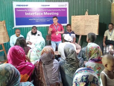 Community Scorecard (CSC) এর চূড়ান্ত সভা “ইন্টারফেস মিটিং” নয়ারহাট ইউনিয়নের উত্তর ফেসকা কমিউনিটি ক্লিনিকে অনুষ্ঠিত হয়। উক্ত সভায় উপস্থিত ছিলেন, স্বাস্থ্য সহকারী মোঃ হাসান আলী, পরিবার পরিকল্পনা পরিদর্শক মোঃ আলমগীর হোসেন, সিএইচসিপি মোঃ অন্তর হাসান, এফডাব্লিউএ মোছাঃ আমিনা খাতুন, নয়ারহাট ইউপি সদস্য, মোঃ আব্দুস সাত্তার, ফ্রেন্ডশিপের সুশাসন প্রকল্পের প্রকল্প ব্যবস্থাপক মোঃ আব্দুল মান্নান, প্রজেক্ট অফিসার মোঃ মেহেদী হাসান প্রমুখ।