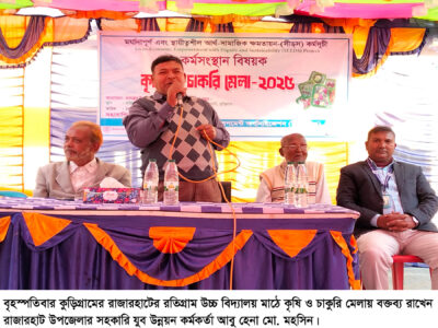 প্রহলাদ মন্ডল সৈকত, রাজারহাট (কুড়িগ্রাম) প্রতিনিধি: কুড়িগ্রাম জেলার রাজারহাট উপজেলার বিদ্যানন্দ ইউনিয়নের রতিগ্রাম বিএল উচ্চ বিদ্যালয় মাঠে ইকো-সোশ্যাল ডেভলপমেন্ট অর্গানাইজেশন (ইএসডিও)-এর মর্যাদাপূর্ণ ও স্থায়ীত্বশীল আর্থ সামাজিক ক্ষমতায়ন কর্মসূচী’র (সীড্স) আওতায় দিন ব্যাপি কৃষি ও চাকুরী মেলা অনুষ্ঠিত হয়েছে। বৃহস্পতিবার দুপুরে মেলা উপলক্ষে এক আলোচনা সভায় বিদ্যানন্দ ইউনিয়নের চেয়ারম্যান মো. তাইজুল ইসলামের সভাপতিত্বে বক্তব্য রাখেন রাজারহাট উপজেলার সহকারি যুব উন্নয়ন কর্মকর্তা আবু হেনা মো. মহসিন, অত্র প্রতিষ্ঠানের প্রধান শিক্ষক মো. খোরশেদ আলম, ইউপি সদস্য ছেফারুল ইসলাম ও উপসহকারী কৃষি কর্মকর্তা আবু তাহের প্রমূখ। এসময় এলাকার গণ্যমান্য ব্যক্তিবর্গ ও ইএসডিও সীড্স প্রকল্পের বিভিন্ন পর্যায়ের উন্নয়ন কর্মীগণ উপস্থিত ছিলেন। পরে অতিথিগণ মেলার বিভিন্ন স্টল পরিদর্শন করেন। সেই সাথে প্রান্তিক পর্যায়ে, তথা ইউনিয়নে এ ধরনের মেলার আয়োজন করায় ইএসডিও কে অভিনন্দন ও কৃতজ্ঞতা জানিয়েছেন।