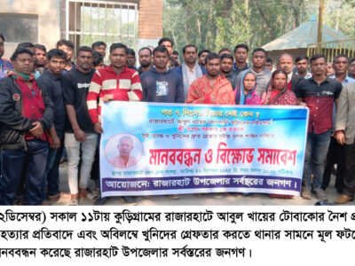 ১২দিনেও আসামী গ্রেফতার হয়নি রাজারহাটে নৈশ প্রহরীকে নৃশংসভাবে হত্যার প্রতিবাদে বিক্ষোভ মিছিল ও মানববন্ধন