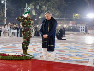শনিবার (২১ ফেব্রুয়ারি) রাত ১২টা ১ মিনিটে ভাষা আন্দোলনের বীর শহীদদের স্মৃতির প্রতি শ্রদ্ধা জানিয়ে তিনি শহীদ মিনারের বেদিতে পুষ্পস্তবক অর্পণ করেন। রাষ্ট্রপতি পুষ্পস্তবক অর্পণ করার পর সেখানে কিছুক্ষণ নীরবে দাঁড়িয়ে থাকেন। এ সময় বিউগলে বেজে ওঠে করুণ সুর।