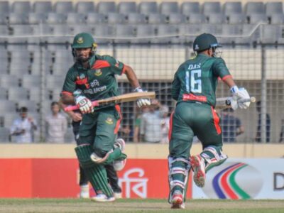 পরপর দুই উইকেট হারানো বাংলাদেশকে এগিয়ে নেওয়ার চেষ্টা করে যাচ্ছেন তাওহিদ হৃদয় ও আফিফ হোসেন ধ্রুব। এই প্রতিবেদন লেখা পর্যন্ত ৩৩ ওভারে বাংলাদেশের স্কোর ৪ উইকেটে ১৪৬ রান।
