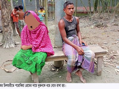 স্টাফ রিপোর্টার: পুরাতন প্রেমিকার শশুর বাড়ীতে দেখা করতে গিয়ে বেরসিক জনতার হাতে ধরা পড়ে শ্রীঘরে গেল দুই সন্তানের জনক পুরাতন প্রেমিক। বৃহস্পতিবার রাতে ঘটনাটি ঘটেছে কুড়িগ্রামের চিলমারী উপজেলার রমনা ইউনিয়নের খরখরিয়া গ্রামে। জানা গেছে, উপজেলার রমনা ইউনিয়নের তেলিপাড়া খেউনিপাড়া এলাকার নুর মোহাম্মদের মেয়ের সাথে খরখরিয়া এলাকার আকবর আলীর পুত্র আনোয়ার হোসেনের বিবাহ হয়। তাদের ঘরে দুটি সন্তানও রয়েছে। আনোয়ার হোসেন জীবিকার তাগিদে ঢাকায় থাকেন। বৃহস্পতিবার রাতে আনোয়ারের স্ত্রীর পুরাতন প্রেমিক খেউনিপাড়া এলাকার মনছুর আলীর ছেলে মন্টু মিয়া (২৫) তার সাথে দেখা করতে আসে। এসময় স্থানীয় জনতা তাদের দুজনকে ধরে বিদ্যুতের খুটির সাথে বেধে রাখে। শুক্রবার সকাল থেকে ওই বাড়ীতে পরোকিয়ার দায়ে ধরা পড়া প্রেমিক যুগলকে দেখতে উৎসুক জনতার ঢল নামে। বেলা ১১টার দিয়ে স্থানীয় থানায় সংবাদ দিলে পুলিশ দুজনকে থানায় নিয়ে আসে। পরে ১৫১ধারায় মন্টু মিয়াকে জেল হাজতে এবং মেয়েকে বাবার বাড়ীতে প্রেরণ করে চিলমারী থানা পুলিশ।